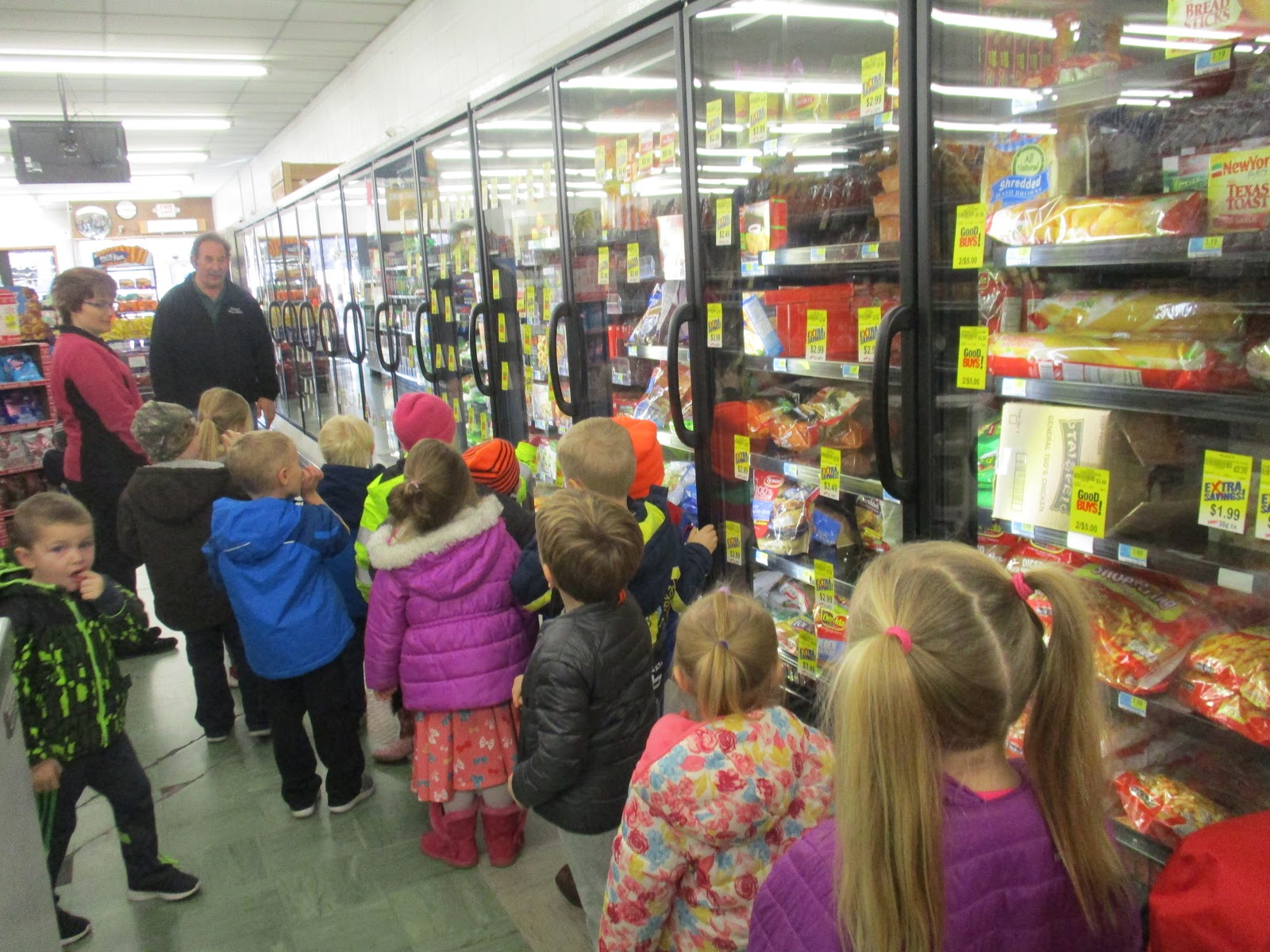 mini field trip to Shaheen’s Grocery Store in town today, because we are turning our dramatic play center into a grocery store! Mark, the owner, showed us the dairy section,